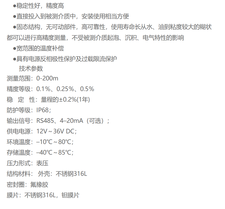 HP-5投入式液位计适用于石油化工、冶金、电力、制药、供排水、环保等系统和行业的各种介质的液位测量。由于其结构简单、安装方便目测量范围大,因此被广泛应用于各种液体介质的测量中,包括水、酸、碱、油等。它特别适用于需要长期稳定运行目对测量精度要求较高的场合。4~20mA、RS485等标准信号输出方式。